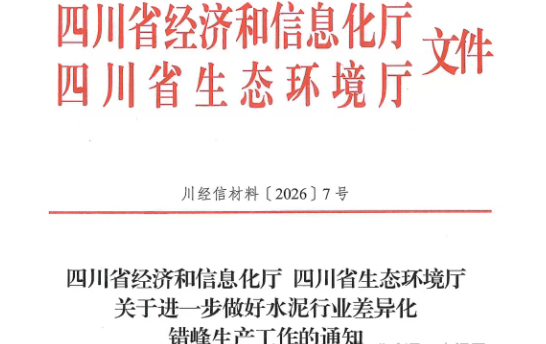 1月13日,四川省經(jīng)信廳 生態(tài)環(huán)境廳聯(lián)合發(fā)布關(guān)于進(jìn)一步做好水泥行業(yè)差異化錯(cuò)峰生產(chǎn)工作的通知。原文如下: