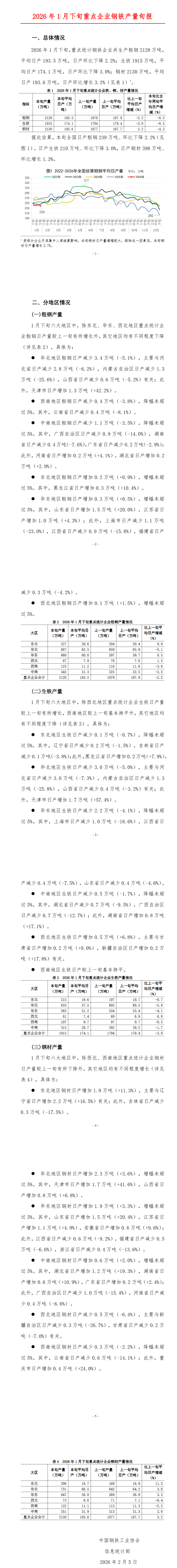 2026年1月下旬,重點統(tǒng)計鋼鐵企業(yè)共生產粗鋼2128萬噸,平均日產193.5萬噸,日產環(huán)比下降2.2%;生鐵1915萬噸,平均日產174.1萬噸,日產環(huán)比下降3.0%;鋼材2130萬噸,平均日產193.6萬噸,日產環(huán)比增長3.2%。
