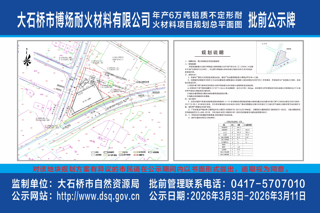 大石橋市博煬耐火材料有限公司年產(chǎn)6萬(wàn)噸鋁質(zhì)不定形耐火材料項(xiàng)目規(guī)劃總平面圖批前公示